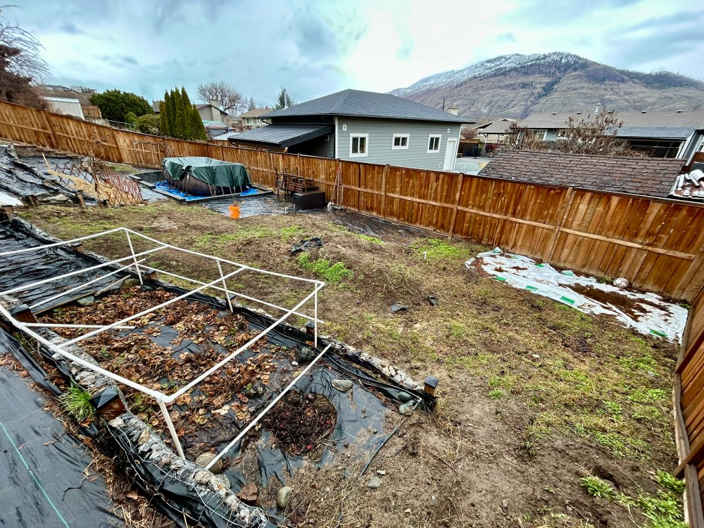 We did have to finally remove one of our original raised bed irrigation lines. It will be in the middle of the new deck, so out it had to come. We just capped it at the main line and will be good to go. The irrigation line where our old strawberry tower was will stay and become our main line to water the lawn. We may pull it back closer to the fence so that it will only need to do a 180* spray rather than a 360. I’m hoping that we can use the sprinkler to irrigate the flower beds there as well, but may have to run some drippers to the actual beds if need be.