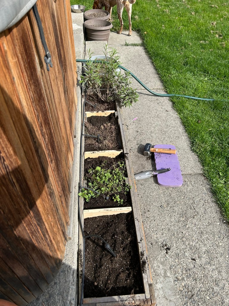 I had noticed some oregano spread in the fall, so I already had this task in the back of my mind as spring has started to fully come around. Luckily, the soil is still quite damp, so it was easy to create little trenches where the dividers needed to go with minimal disruption to the plants roots, though I did have to hack out some of the oregano roots, which were most definitely spreading in all directions.